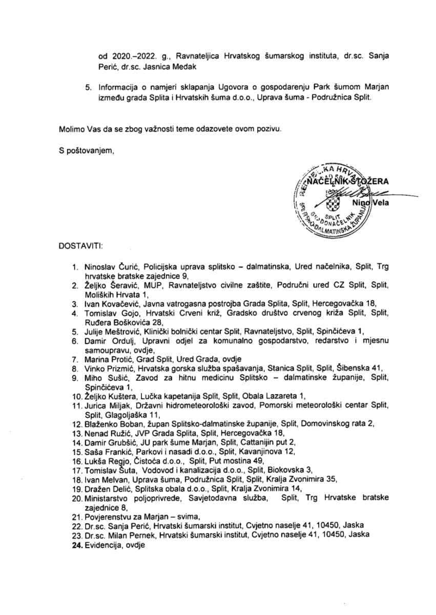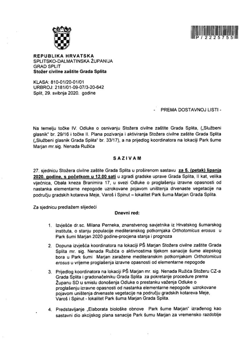 "Hvala na pozivu na 27. sjednicu Stožera civilne zaštite Grada Splita u svezi Odluke o proglašenju izravne opasnosti od nastanka elementarne nepogode uzrokovane pojavom potkornjaka.