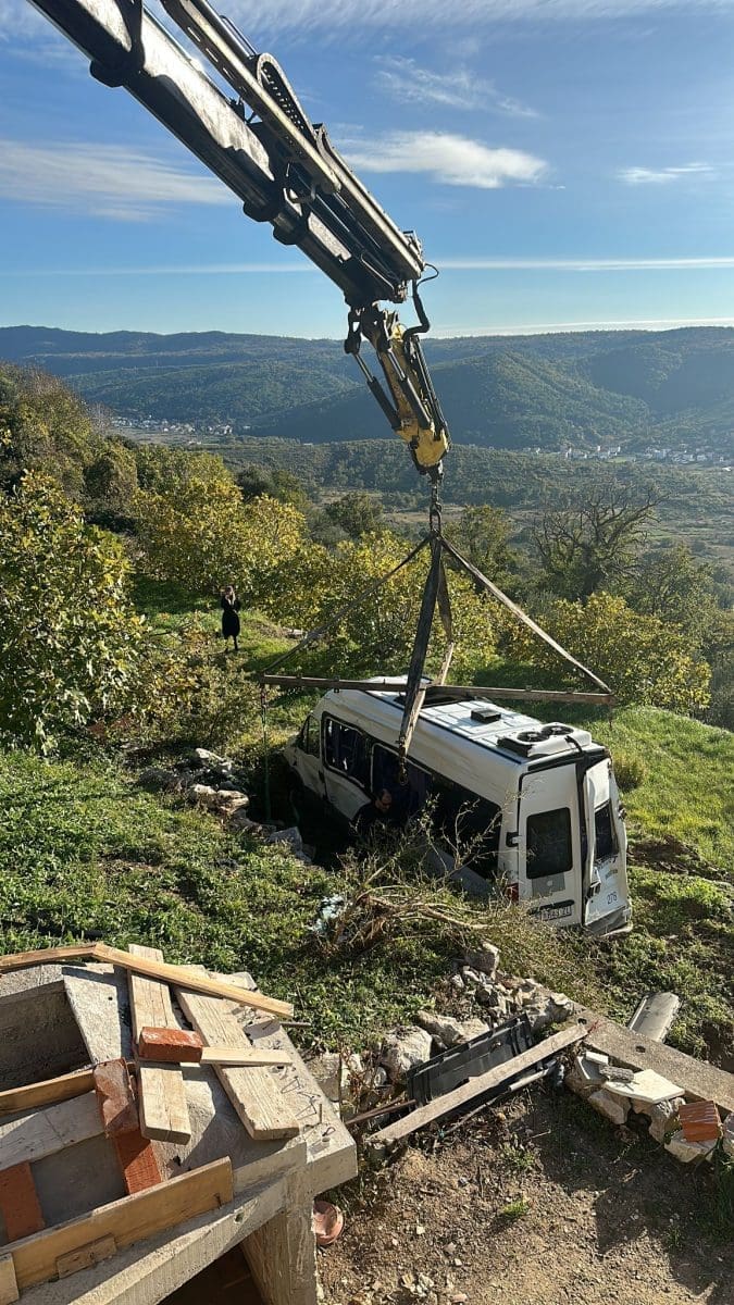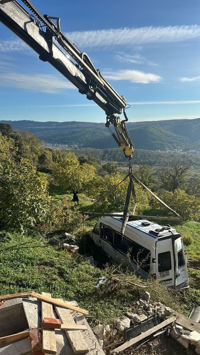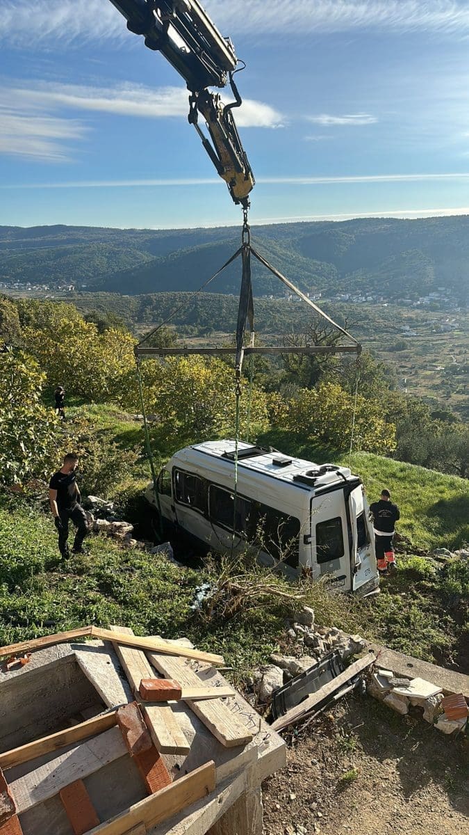 Dalmacija Danas je na licu mjesta. Danas, dva dana kasnije, službe su počele s uklanjanjem mini busa iz vrta obiteljske kuće, a iza 14 sati mini bus je uklonjen.