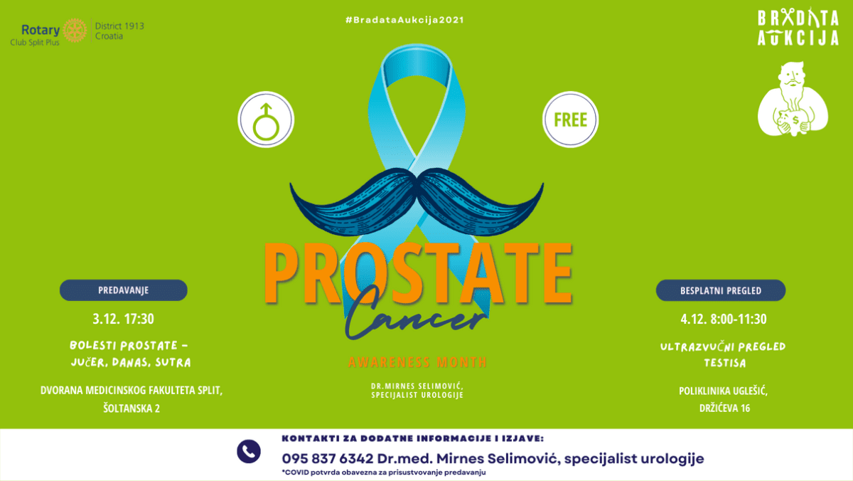 Ovogodišnje izdanje BRADATE AUKCIJE oplemenjeno je sa dva nova sadržaja koje provodi Rotary klub Split PLUS, a za cilj ima poticanje javnosti na edukaciju o važnosti preventivnih pregleda. Zahvaljujući dr.med. Mirnesu Selimoviću, specijalistu urologije, organizira se predavanje na Medicinskom fakultetu o bolestima prostate i besplatan ultrazvuk za muškarce.