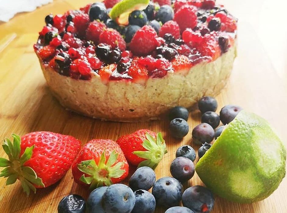 Izvadite kolač od tave i stavite na stalak za torte. Ukrasite voćem i ukusom limete.