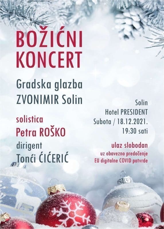 Gradska glazba "Zvonimir" Solin priređuje svoj tradicionalni Božićni koncert, u subotu, 18. prosinca 2021., s početkom u 19:30 sati u Hotelu President u Solinu.