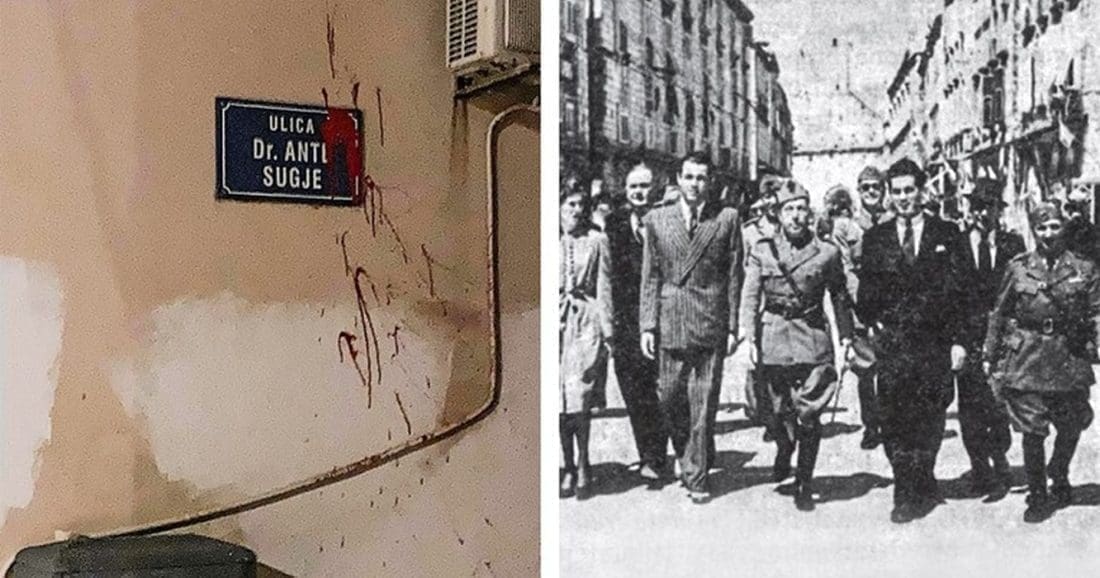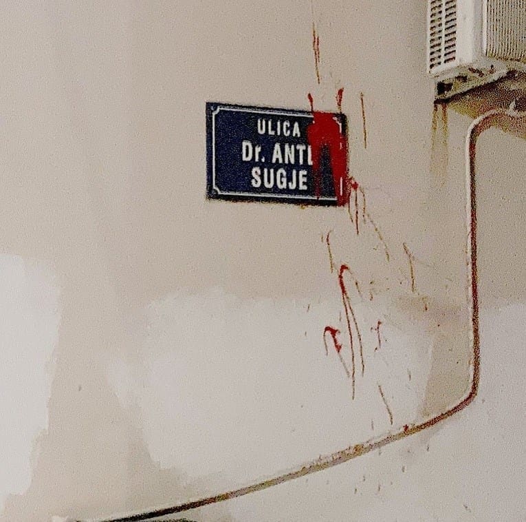 Naziv Ulice Ante Sugje u Dubrovniku netko je zalio crvenom bojom. Ulica je to koja se nalazi u gradskom predjelu Gruž. Očito je da se radi o smišljenom, a ne nasumičnom činu budući da je sama činjenica kako jedna ulica nosi ime po Anti Sugji sporna.