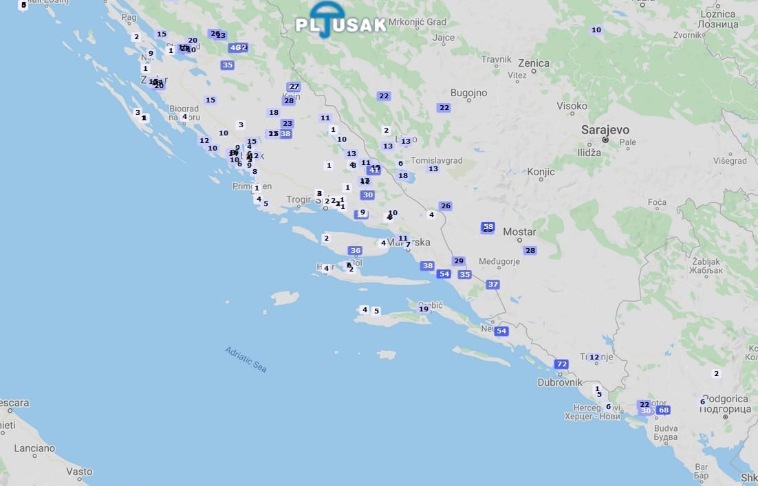 Zaostrog je primio 54 litre kiše po kvadratnom metru, a slijede Ston 53, Golubić 44, Drniš 38, Živogošće 38, Vid 37, Bol 36, Staševica 35, Omiš 34, Vela Njiva - Prančevići 30.