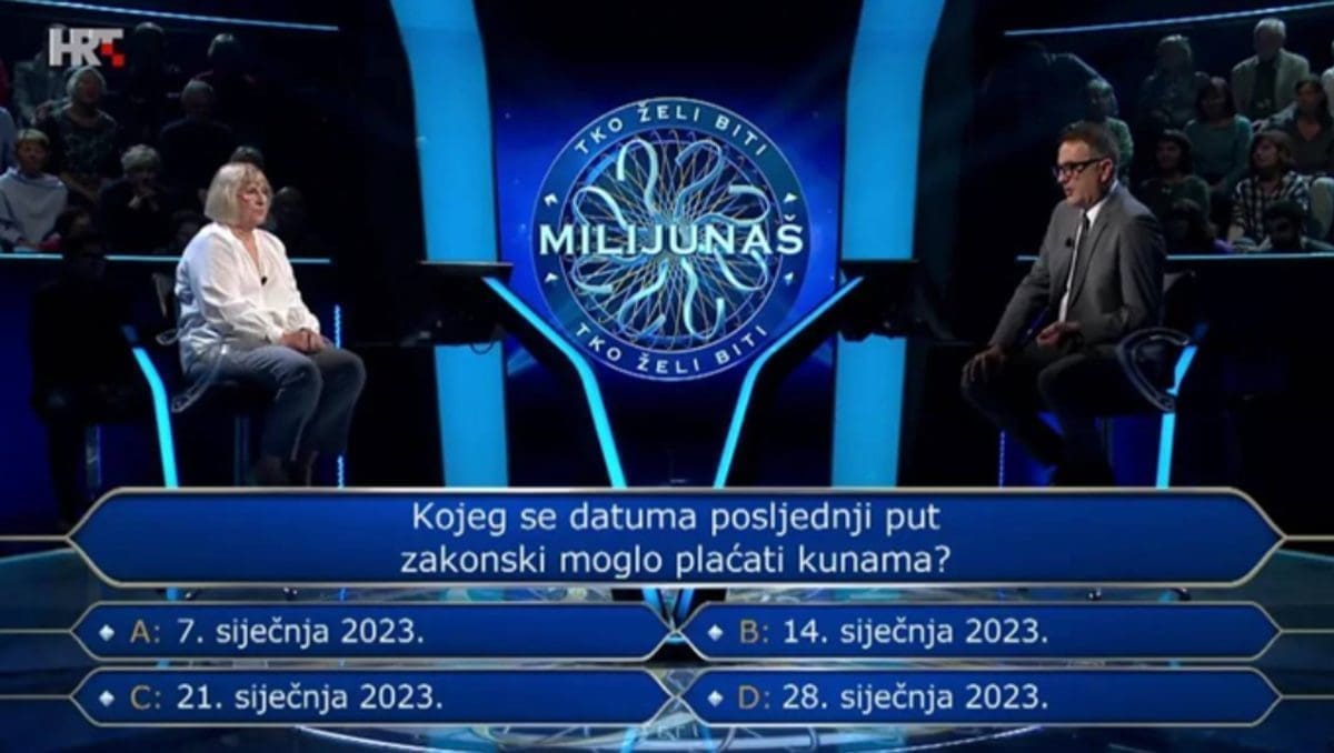 "Kojeg se datuma posljednji put zakonski moglo plaćati kunama?", glasilo je pitanje, a Branka se dvoumila između ponuđenih odgovora pod b i c, točnije 14. siječnja 2023. i 21. siječnja 2023., piše Index.