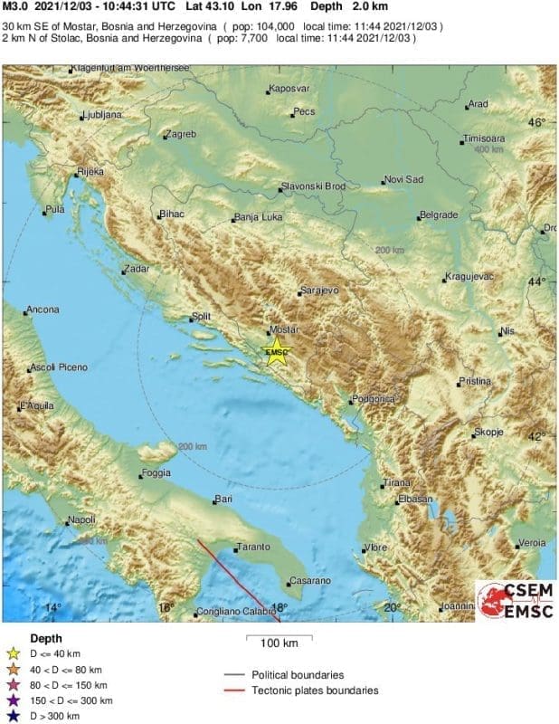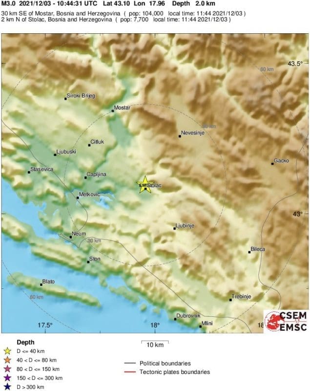 Prema podacima EMSC-a, magnituda potresa je iznosila 3.0 prema Richteru, a epicentar je bio 2 kilometra od Stoca, na području južne Bosne i Hercegovine.
