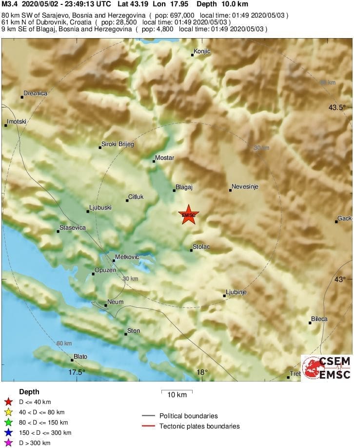 Prema podacima EMSC-a, umjereno jak potres osjetio se u susjednoj Bih u 1 sat i 49 minuta nakon ponoći. Magnituda potresa bila je 3,4 po Richteru, a epicentar mu je bio 10 kilometara sjeverno od Stolca, te 61 kilometar sjeverno od Dubrovnika.