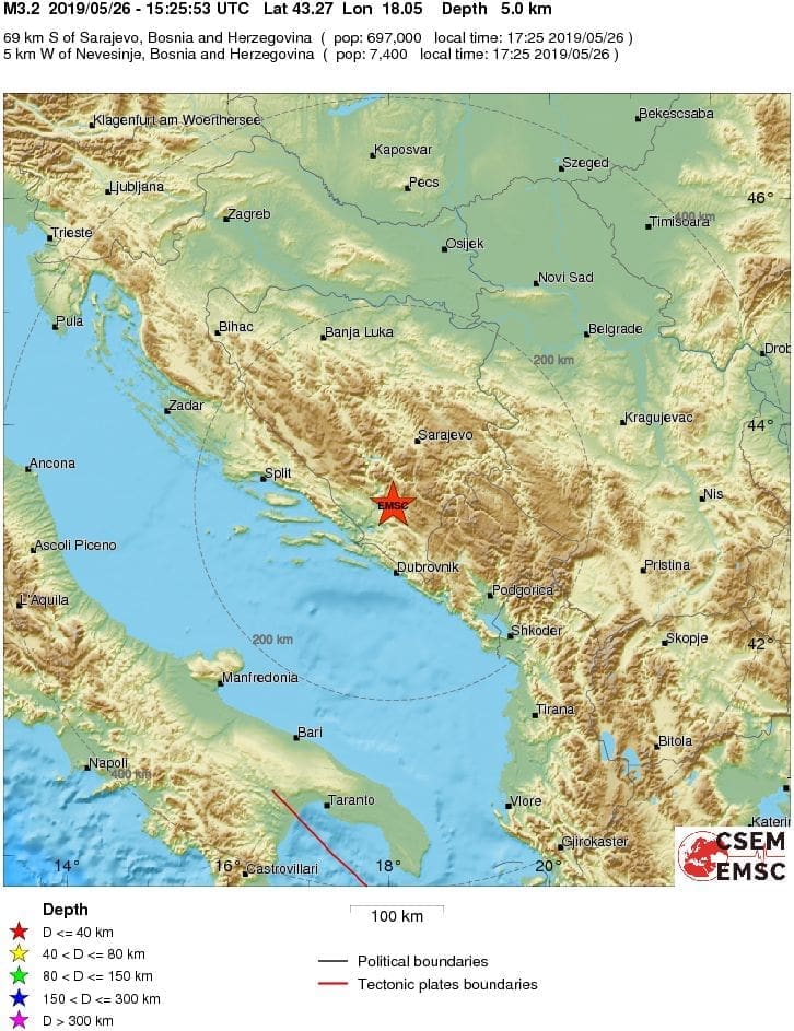 U nedjelju poslijepodne u 17 sata i 25 minuta seizmografi Seizmološke službe zabilježili su umjeren potres s epicentrom dvadesetak kilometara istočno od Mostara.