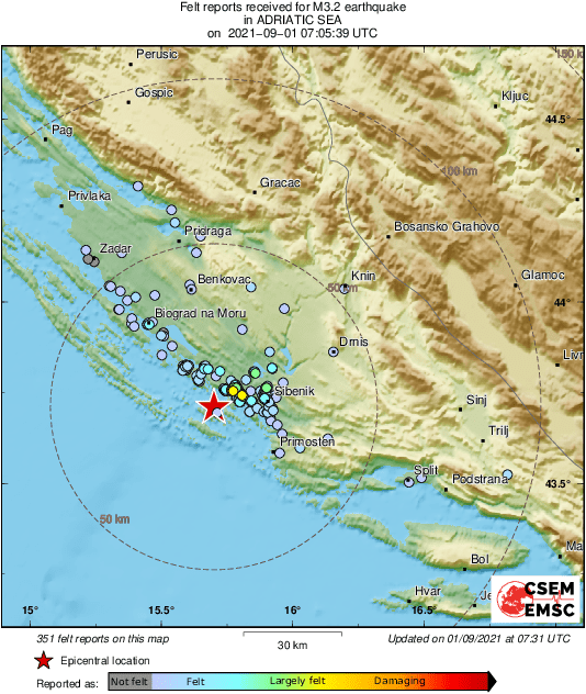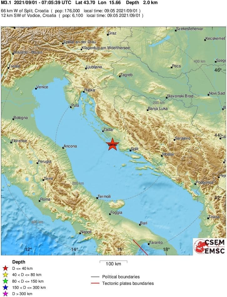 Prema podacima EMSC-a, magnituda potresa iznosila je 3.2 prema Richteru, a epicentar je bio 16 kilometara zapad-jugozapadno od Šibenika, odnosno 64 kilometra zapadno od Splita.