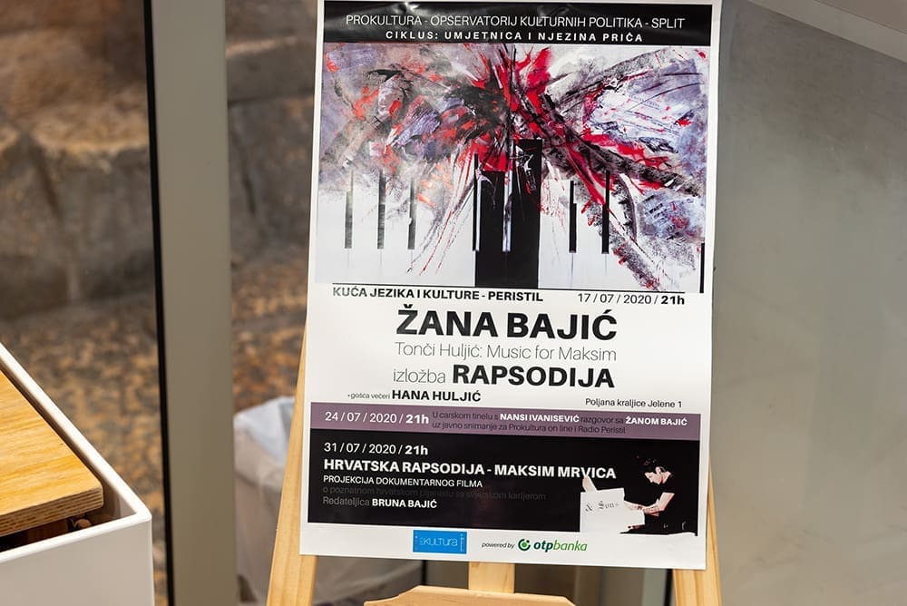 Prokultura – Split ovaj vikend u svojoj Kući jezika i kulture – Peristil powered by OTP upriličila je još jedno izuzetno kulturno – umjetničko događanje. Radi se o izložbi slika umjetnice Žane Bajić koja na Peristilu izlaže u sklopu Prokulturinog ciklusa „Umjetnica i njezina priča“. Inspirirala se producirajući dokumentarac o hrvatskom pijanistu svjetskoga glasa Maksimu Mrvici. Sinergija trenutka, slikarstva i glazbe koju je Tonči Huljić skladao za Maksima bila je stimulator za nastanak slika iz ciklusa "RAPSODIJA".