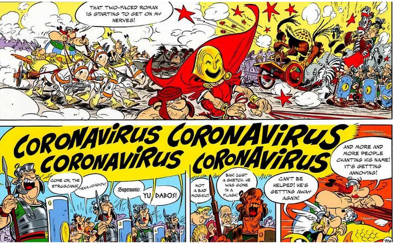Zanimljivo, u jednom od svojih stripova, Uderzo je spomenuo i coronavirus! Radi se o nastavku s utrkama konjskih zaprega javlja se nadmoćni jahač koji je zabilježio čak 1.462 pobjede i stigao je ravno iz Rima pobijediti u utrci s Galima. Na početnim stranicama stripa publika pjevala "Coronavirus".