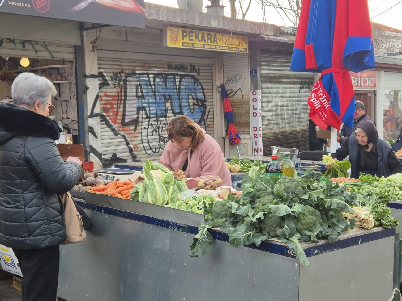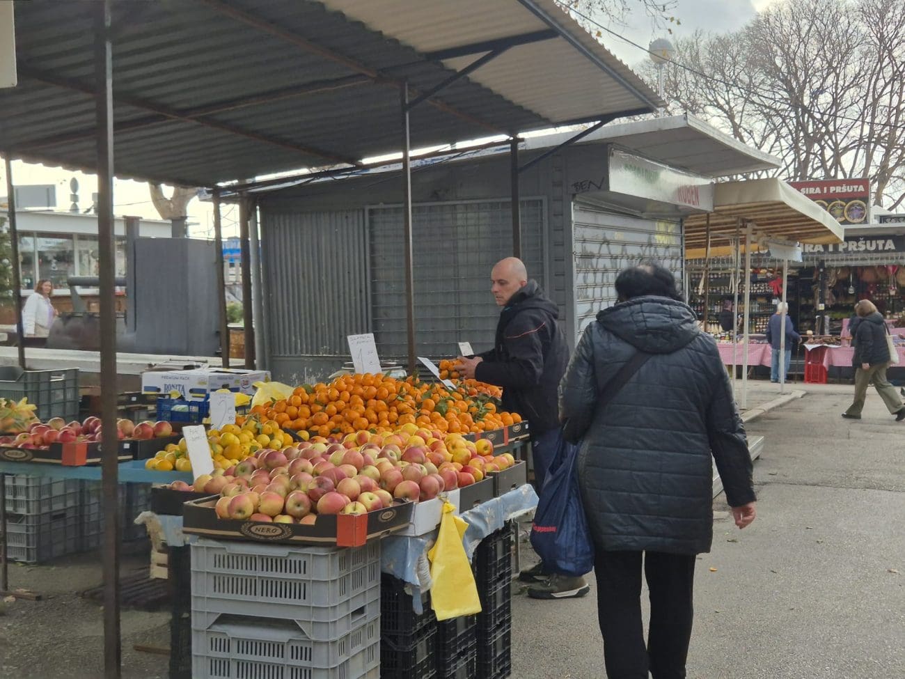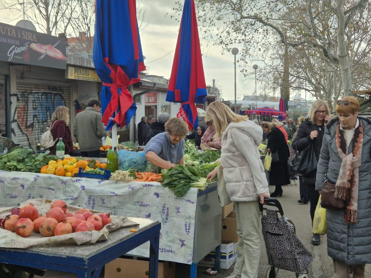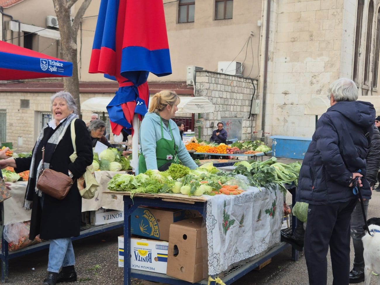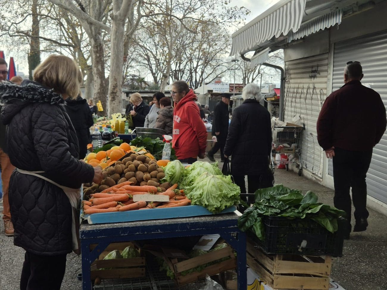 Već oko 10 sati dio prodavača počeo je zatvarati štandove jer je roba planula, no izbor je i dalje bio solidan – osobito za one koji su tražili namirnice za današnji ručak ili su se željeli opskrbiti za nadolazeći tjedan. Kilogram blitve prodaje se po cijeni od 4 eura, salata i cvjetača stoje 2 eura, rajčice 2,50 eura, dok se domaći krumpir može pronaći za 1,50 euro po kilogramu.