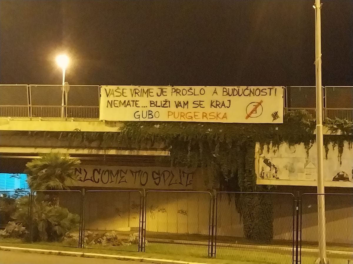 Na transparentu je ispisano "Vaše vrime je prošlo a budućnosti nemate... bliži vam se kraj gubo purgerska".