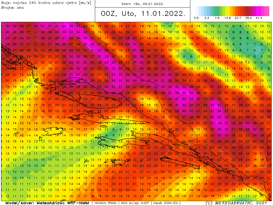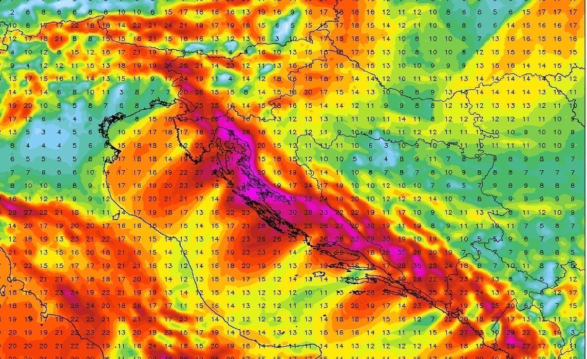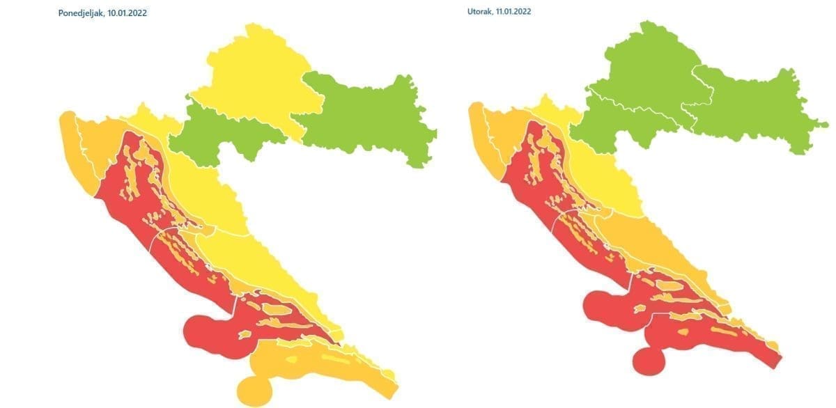 Prva dva dana tjedna na cijelom Jadranu će obilježiti bura koja će biti jaka s olujnim, ponegdje i orkanskim udarima. DHMZ je, unutar sustava MeteoAlarm, za velik dio Jadrana izdao crveni, najviši stupanj upozorenja na opasne meteo pojave. Pri tome se u Podvelebitskom kanalu u ponedjeljak i utorak očekuju najjači udari do 165 km/h, a u Dalmaciji do 140 km/h.