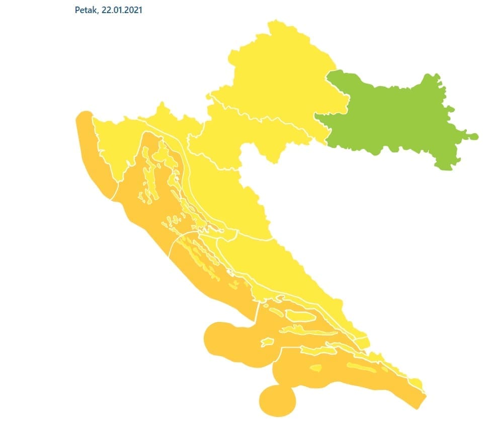 Pretežno oblačno, povremeno uz kišu bit će danas. Ipak, danas se ne očekuju značajne količine oborina. Puhat će umjereno jako jugo s vrlo jakim udarima. Od jutra osjetno toplije u odnosu na prethodne dane, a najviše dnevne temperature većinom do 9 do 15°C.