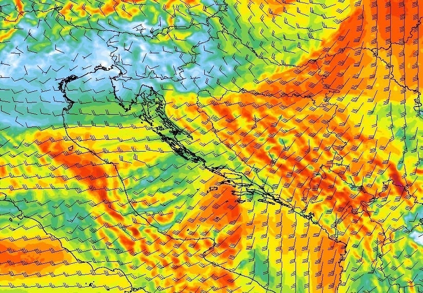DHMZ je, unutar sustava MeteoAlarm, izdao narančasto i žuto upozorenje u petak za cijeli Jadran. Na moru su mogući udari vjetra do 95 km/h, a lokalno se očekuju neverini.