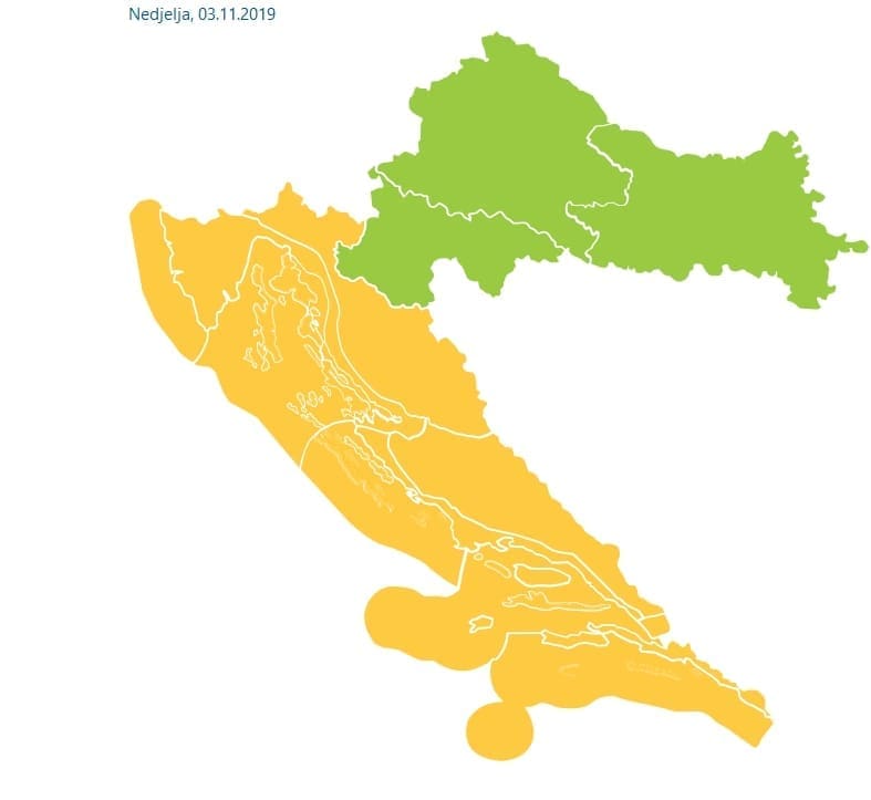 DHMZ je, unutar sustava MeteoAlarm, izdao narančasti stupanj upozorenja za cijeli Jadran. On se odnosi na vjetar na moru te na mogućnost obilnih oborina uz obalu i osobito u Zagori.