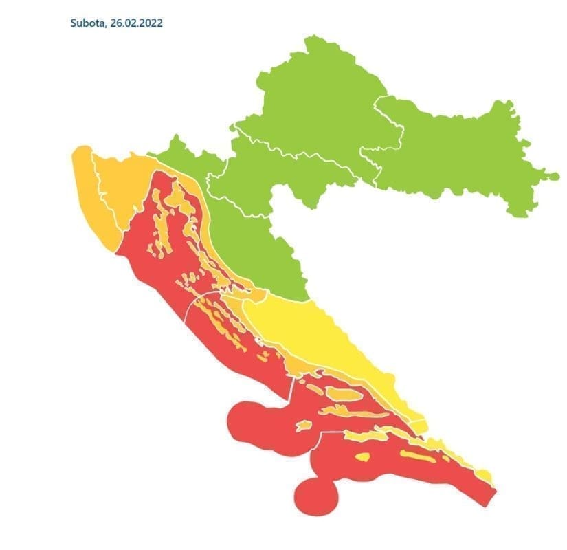 DHMZ je unutar sustava MeteoAlarm za cijelu obalu izdao crveni stupanj upozorenja i to zbog udara bure do 130 km/h.