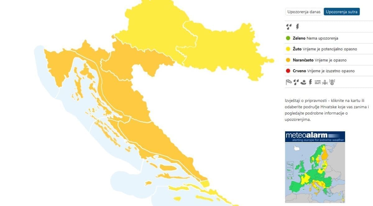 DHMZ je, unutat sustava MeteoAlarm, za prvi dio utorka za Dalmaciju dao narančasti stupanj upozorenja na opasne meteorološke pojave. DHMZ upozorana na mjestimičnu obilnu kišu, čak do 55 mm, te vjerojatno grmljavinskog nevremena: