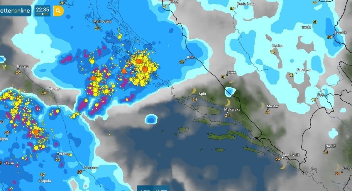 Pred nama je kratkotrajna, ali intenzivna promjena vremena. Donosi nam je frontalni poremećaj koji nam se primiče sa zapada i koji je već zahvatio akvatorij sjeverne Dalmacije. Jače naoblačenje noćas će se proširiti na cijelu Dalmaciju pa će u mnogim predjelima biti kiše, pljuskova i grmljavine. Lokalno je moguće jače grmljavinsko nevrijeme i preko 30 litara kiše po kvadratnom metru u kratkom vremenu. Zbog obilnih oborina u kratkom vremenu, ponegdje su moguće bujice.