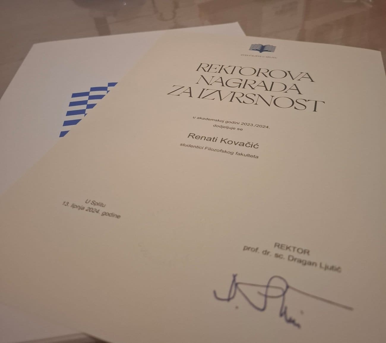 Renata Kovačić studentica je prve godine diplomskog studija Hrvatskog i Njemačkog jezika, te Književnosti na splitskom Filozofskom fakultetu. Prethodno je završila tri godine preddiplomskog studija na istom fakultetu gdje je dobila Rektorovu nagradu za izvrsnost i nagradu fakulteta.