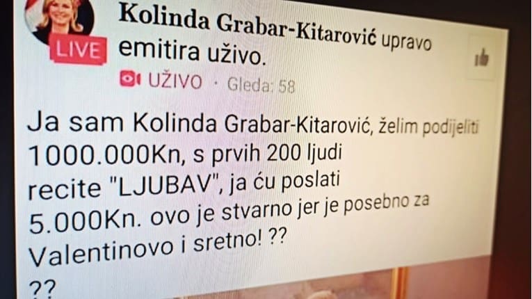 "Ja sam Kolinda Grabar-Kitarović, želim podijeliti 1.000.000 kuna, s prvih 200 ljudi recite 'LJUBAV', ja ću poslati 5.000 kuna. Ovo je stvarno jer je posebno za Valentinovo i sretno", stoji u objavi.