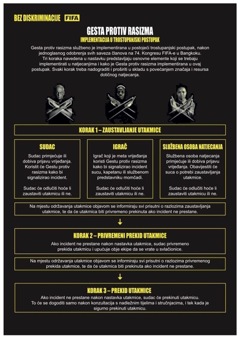 Ako ste doživjeli rasističko zlostavljanje, upotrijebite GESTU PROTIV RASIZMA (ruke prekrižene na prsima) i sudac će zaustaviti utakmicu.