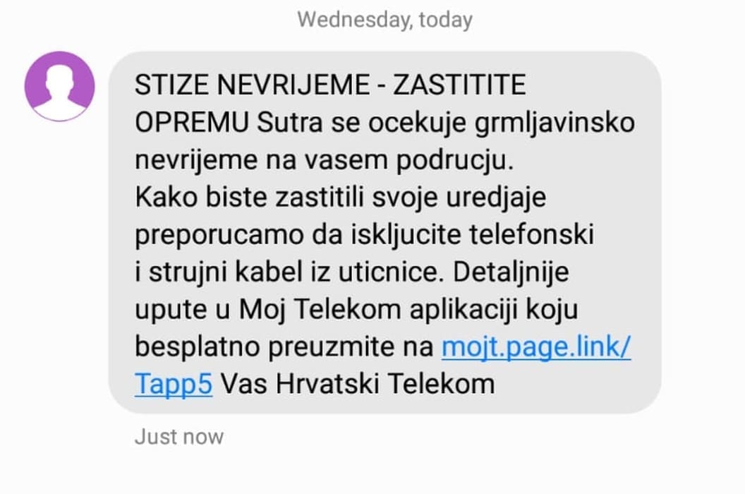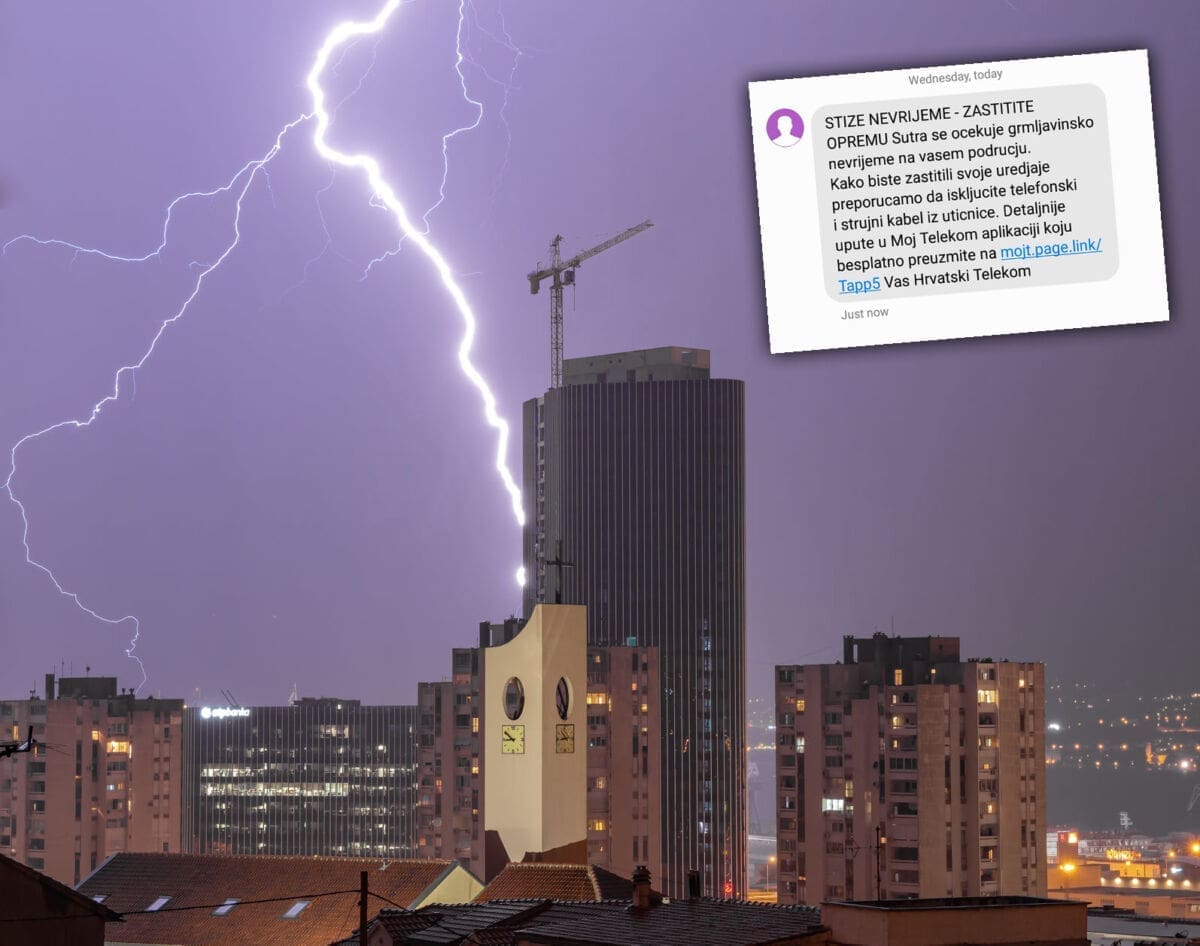 "Stiže nevrijeme, zaštitite opremu. Sutra se očekuje grmljavinsko nevrijeme na vašem području. Kako biste zaštitili svoje uređaje, preporučamo da isključite telefonski i struni kabel iz utičnice" - stoj u obavijesti koju je Hrvatski Telekom poslao korisnicima u srijedu poslijepodne.