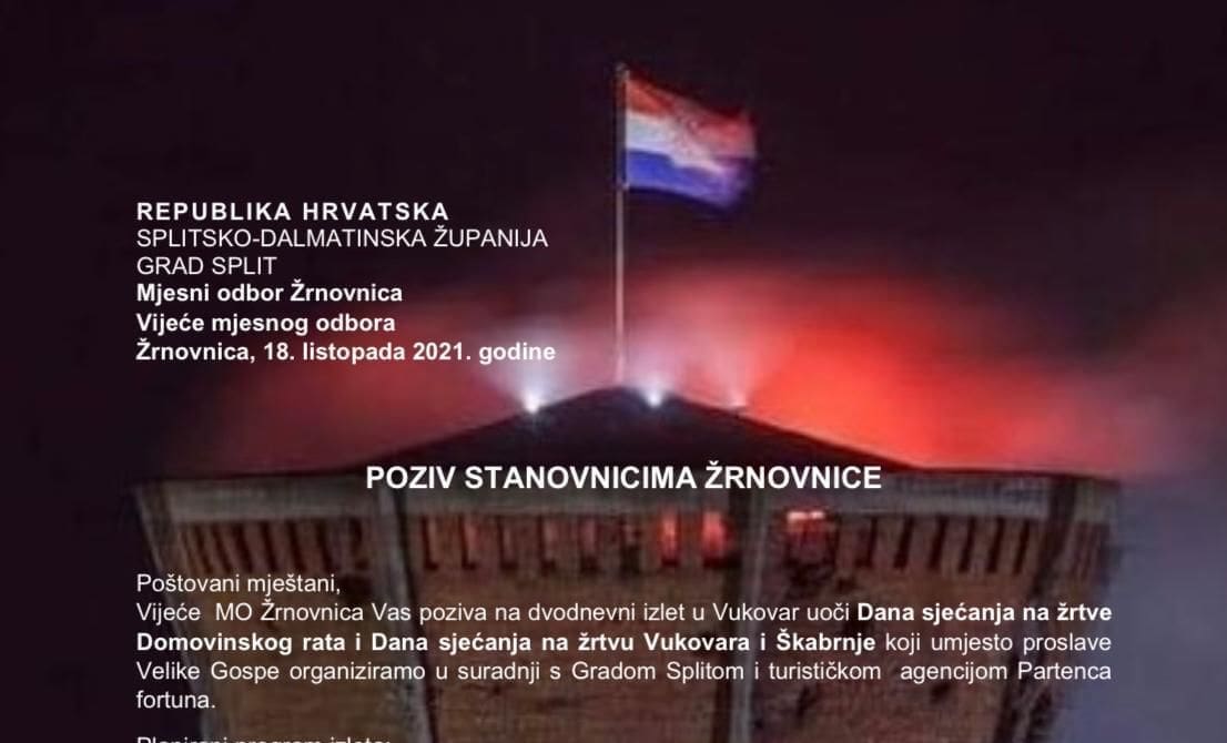 Vijeće MO Žrnovnica stanovnike mjesta poziva na dvodnevni izlet u Vukovar uoči Dana sjećanja na žrtve