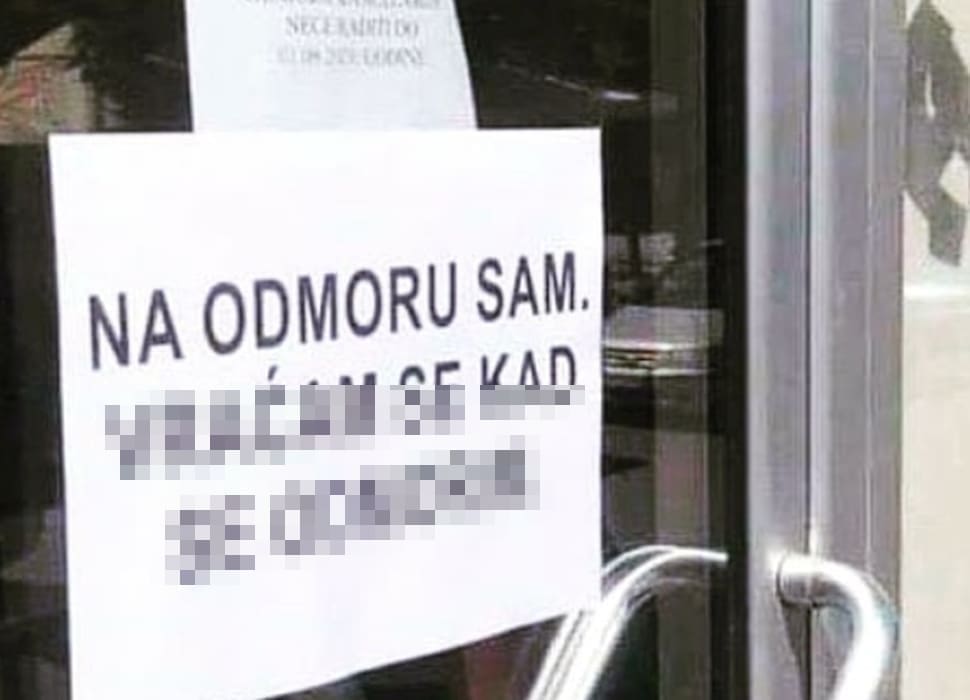 Na jednim vratima u Dalmaciji postavljen je natpis na kojemu piše originalna poruka: "Na odmoru sam. Vraćam se kada se odmorim".