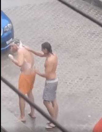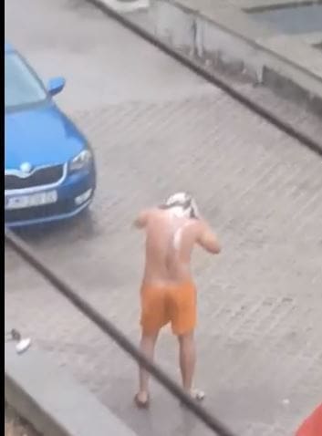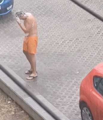 Na ulici se našamponirao, a zatim je pjenu ispirao kišom. Ubrzo mu je u pomoć s pranjem priskočio i drugi muškarac.