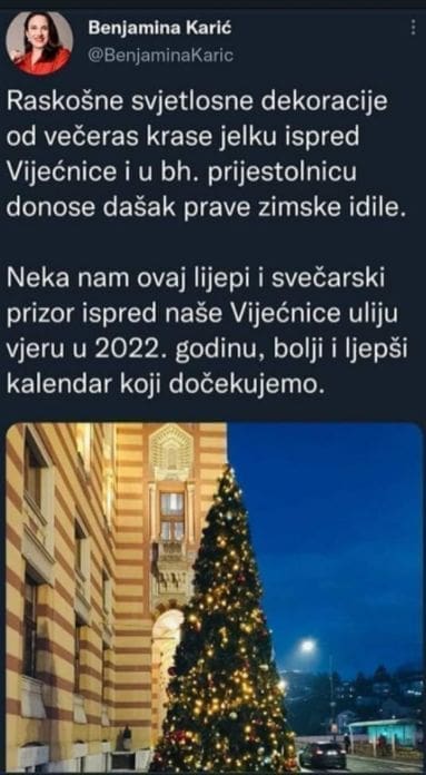 Gradonačelnica Sarajeva Benjamina Karić je na Twitteru objavila fotografiju okićenog bora, ali je izbjegla spomenuti povodom kojeg blagdana je taj bor okićen i istaknut.