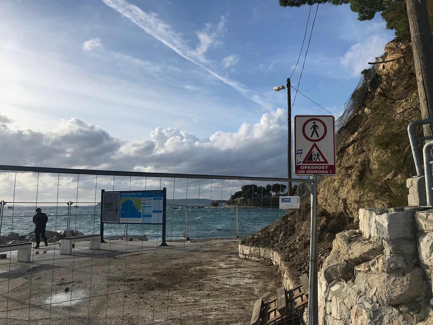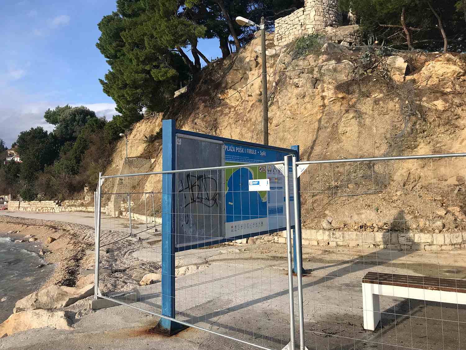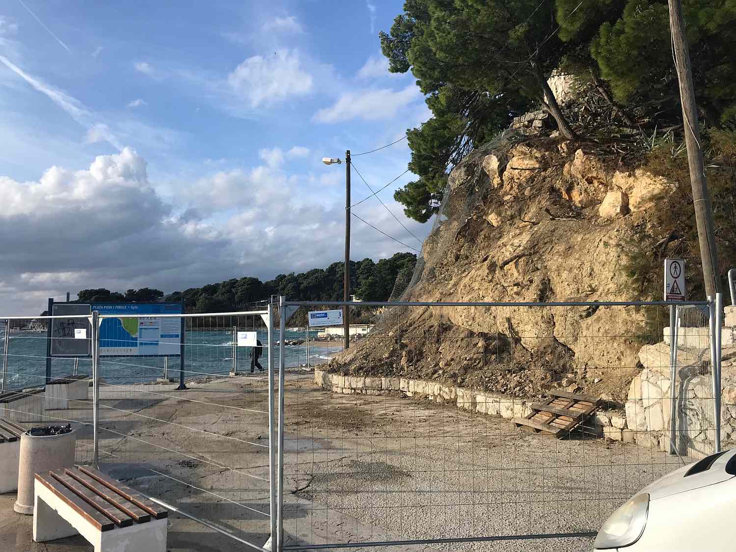 A prije niti 48 sati odronila se zemlja i stijene također na Firulama, uz rub nekadašnjeg kluba Shakespeare, gdje je to konstantna prijetnja. Unatoč zaštitnim mrežama, oborine i vjetar prijete novim odronima pa je cijeli dio ograđen, ostao je uski prolaz na samoj plaži. Još uvijek se čeka prava sanacija pokosa, navodno dogodine, a dotad će se situacija regulirati prometnim znakom pa dur-dur, dok netko ne nastrada...