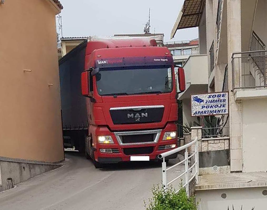 Zanimljiv prizor mogao se vidjeti u petak poslijepodne u Podgori. Kako nam javljaju čitatelji, jedan šleper zaglavio je u uskoj ulici između dva objekta u Ulici Tina Ujevića.