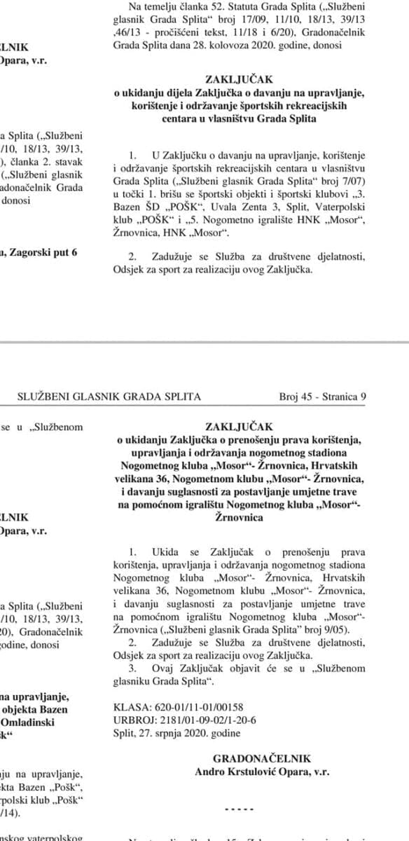 Potvrđeno nam je to iz Banovine, kako dio s “oduzimanjem” upravljanja stadiona HNK Mosoru, tako i dio (treba ga “amenovati” Gradsko vijeće) s odlukom o davanju terena Pricviće na upravljanje JU Športski objekti.