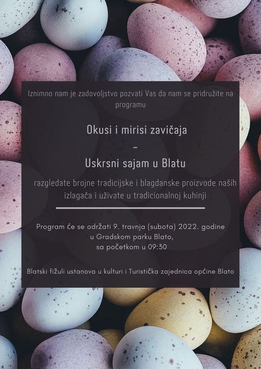 U Blatu će se u subotu, 9. travnja 2022., u Gradskom parku u Blatu održati Uskrsni sajam pod sloganom „Okusi i mirisi zavičaja“. Sedmi po redu Uskrsni sajam po prvi puta se održava u Gradskom parku u Blatu i u suorganizaciji dviju ustanova Turističke zajednice općine Blato i Blatski fižuli, ustanova u kulturi.