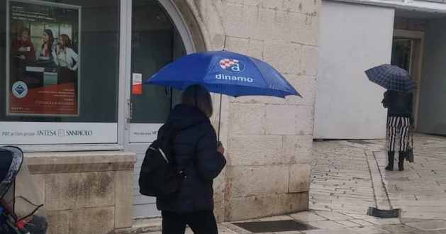 Kao što vidimo, žena, očito nesvjesna kakav je kišobran uzela u ruku, zaštitila se od kiše reklamnim kišobranom Dinama.