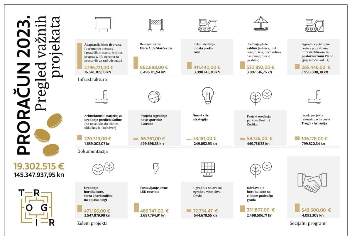 Gradsko vijeće Grada Trogira izglasalo je proračun za 2023. godinu vrijedan 145.347.937,95 kuna, odnosno 19.302.515,00 eura s 10 glasova za, 2 protiv i jednim suzdržanim. Ovo je najveći proračun u povijesti grada, veći za 7 posto u odnosi na lanjski.