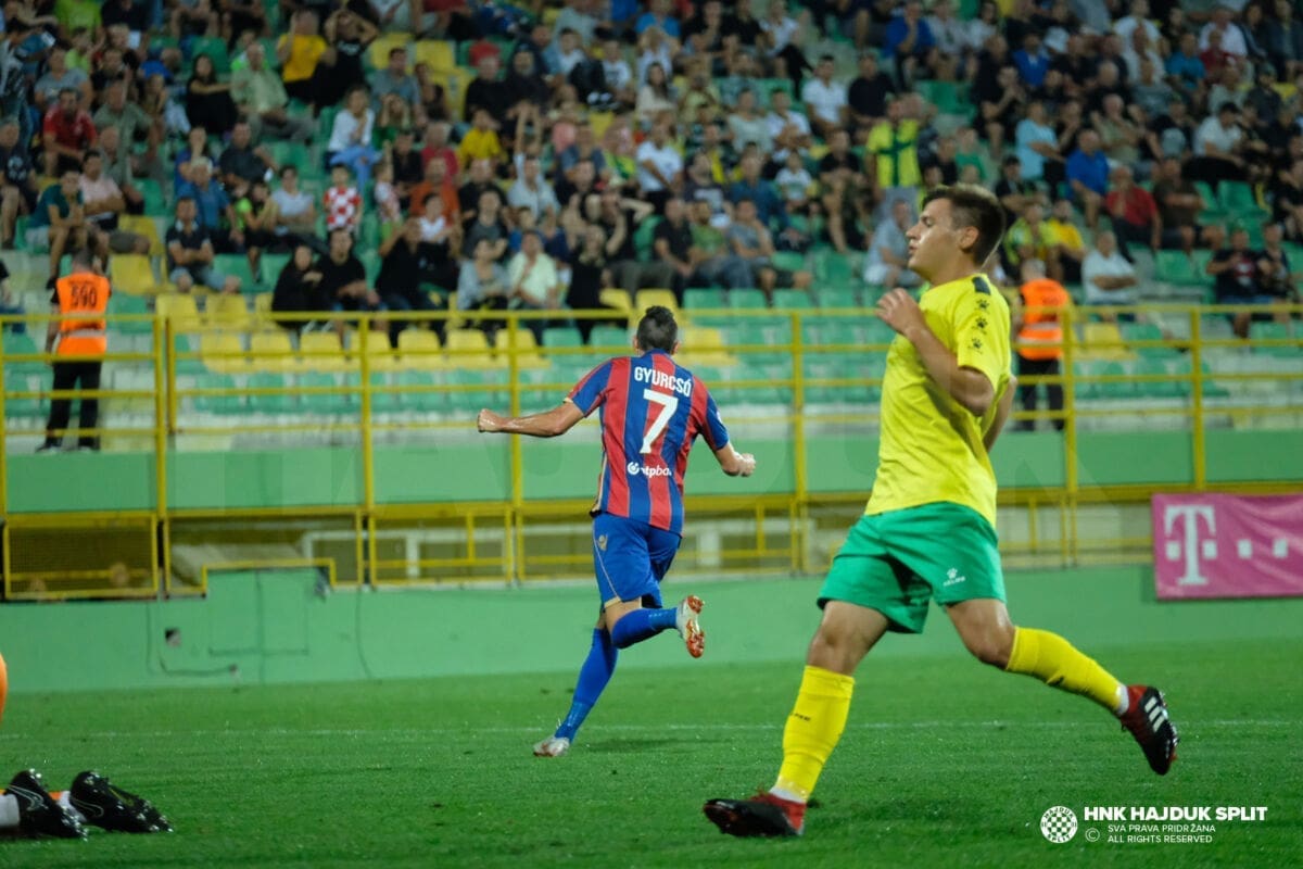 Prvi centaršut uputili su domaći igrači, opasnost je otklonio Filip, a zatim je Hajduk krenuo s konkretnijim akcijama. U 7. je minuti dvaput pokušao Gyurcso, prvo udarcem sa 17 metara, a zatim i volejom koji je završio iznad gola. Mađar je potom pokušao i iz dvaju kornera, bez veće uspjeha, a potom je visok udarac s 12 metara uputio Caktaš. Posjed lopte Hajduku se ipak isplatio već u 21. minuti kad su prisilili Istrinu obranu na pogrešku u kojoj se Gyurcso domogao lopte i mirno zabio za 1-0. Već četiri minute kasnije isti je igrač povisio na 2-0, ovaj put nakon sjajne asistencije Jaira i prisebne realizacije jedan na jedan s Istrinim vratarom Čondrićem.