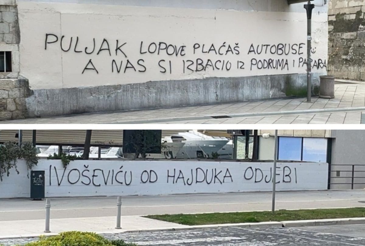 U centru Splita pojavile su se uvredljive poruke upućene gradonačelniku Ivici Puljku, dogradonačelniku Bojanu Ivoševiću i predsjedniku Republike Hrvatske Zoranu Milanoviću.
