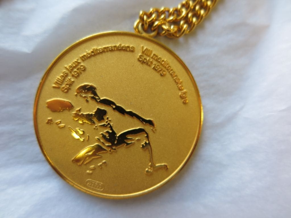 Zlatna medalja s Mediteranskih igara u Splitu 1979. vaterpolista Ratka Rudića, izrada: Boris Ljubičić, Zagreb i Ikom Zagreb, 1979., HŠPOM-9533