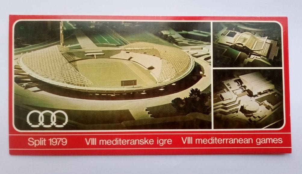 Razglednica Sportski objekti MIS'79 prikazuje sportske objekte (današnji Poljud) na kojima su se održavale Mediteranske igre u Splitu 1979., izrada: Zadružna štamparija u Zagrebu, Zagreb, 1979., HŠPOM-10839.