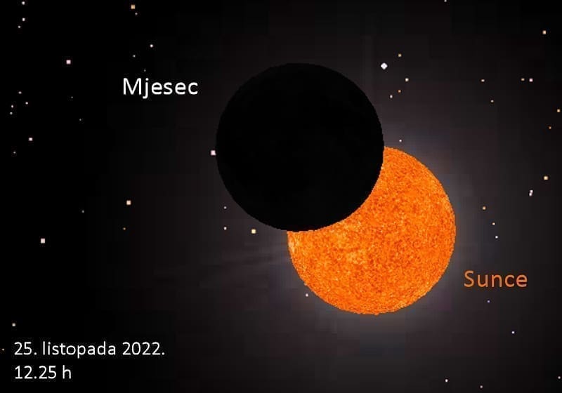 Dana 25. listopada (utorak), bit će iz naših krajeva vidljiva djelomična pomrčina Sunca. Ako vremenski uvjeti to dopuste, udruga Zvjezdano selo Mosor će provesti javno promatranje te pojave sa Zapadne obale, uz uporabu teleskopâ.