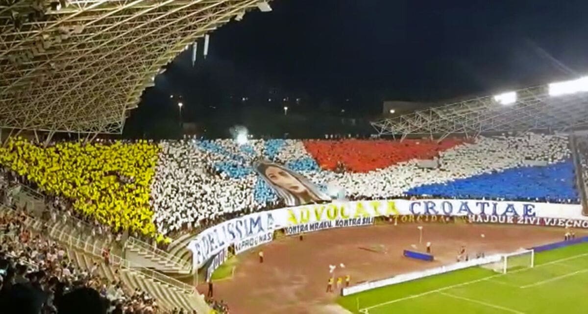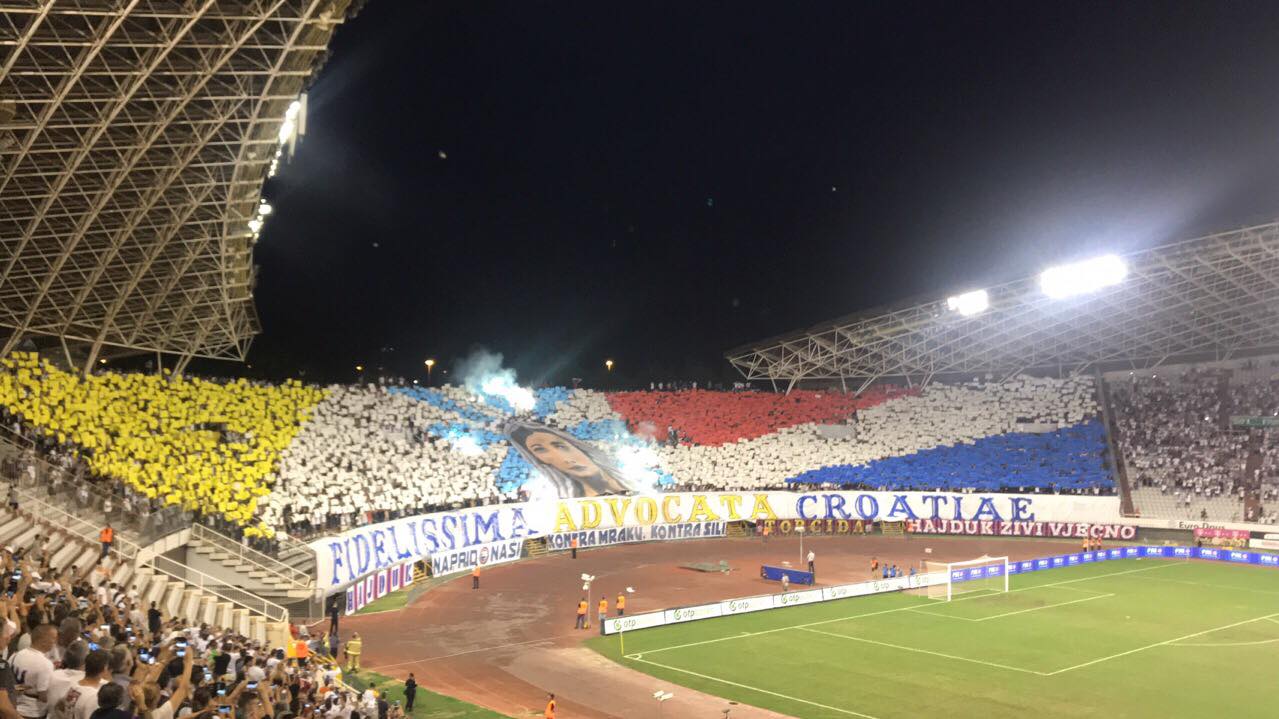 0. - Sudac je označio početak utakmice. Torcida je pred utakmicu podigla spektakulatnu koreografiju sa slikom Gospe uz poruku Rajska djevo kraljice Hrvata.