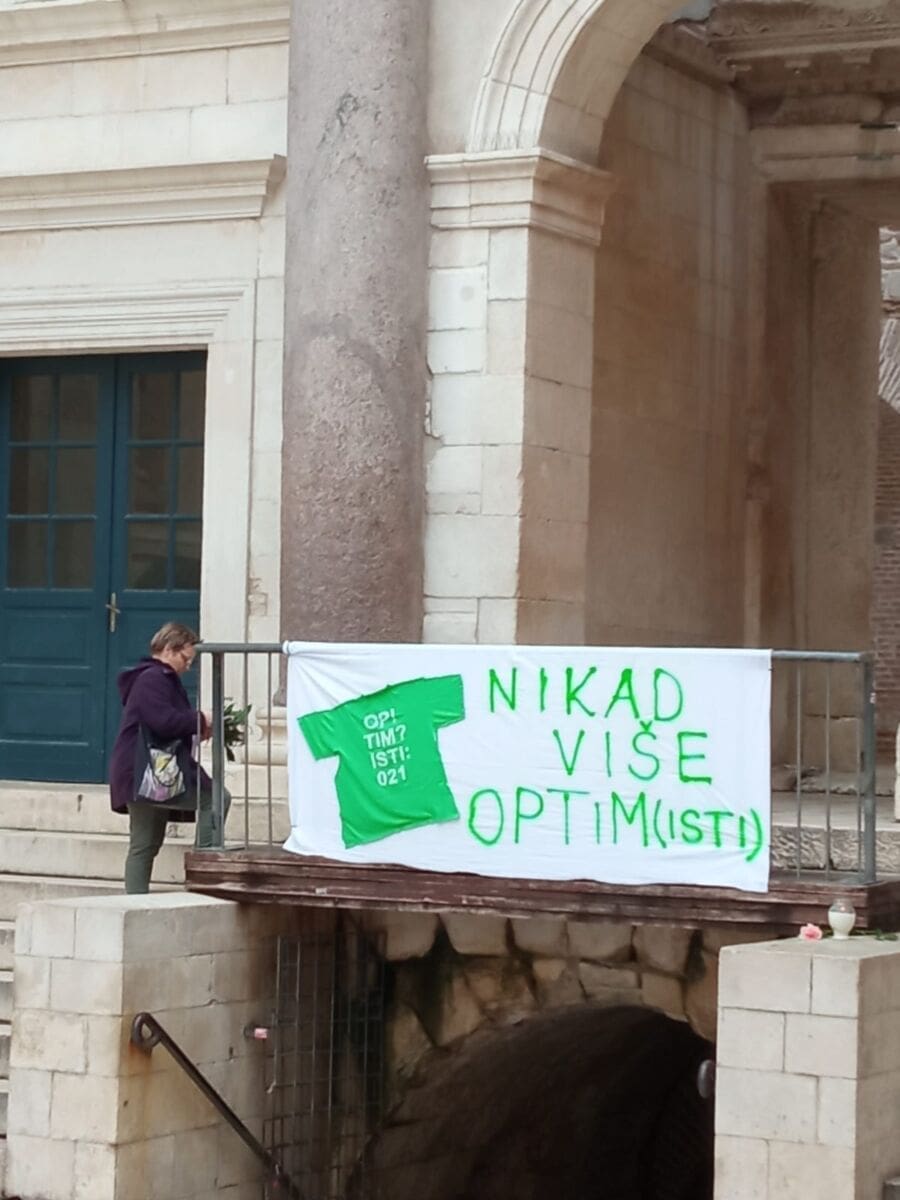 Doznajemo da su se već određeni građani Splita okupili na Peristilu. A njegovi dugogodišnji obožavatelji izvjesili su transparent u obliku majice na kojoj piše: "Nikad više optim(isti)".