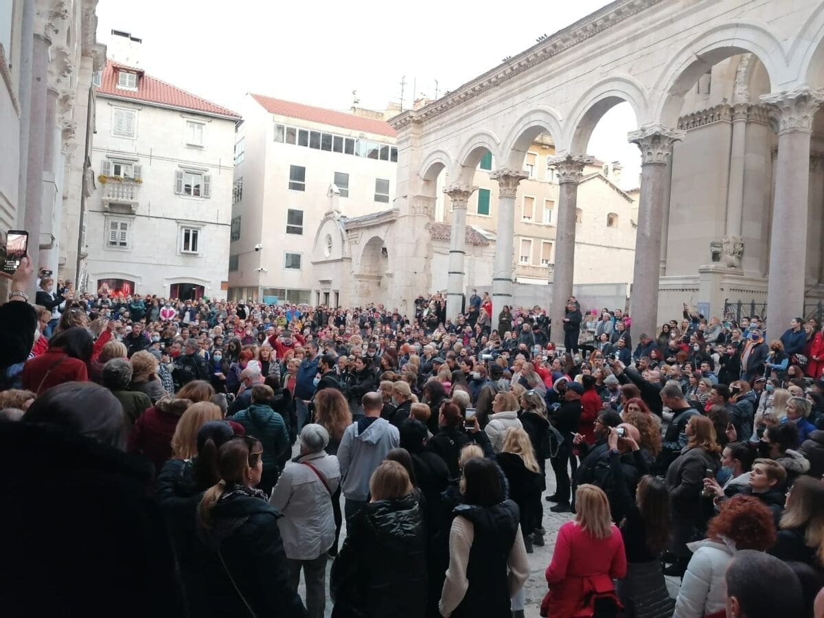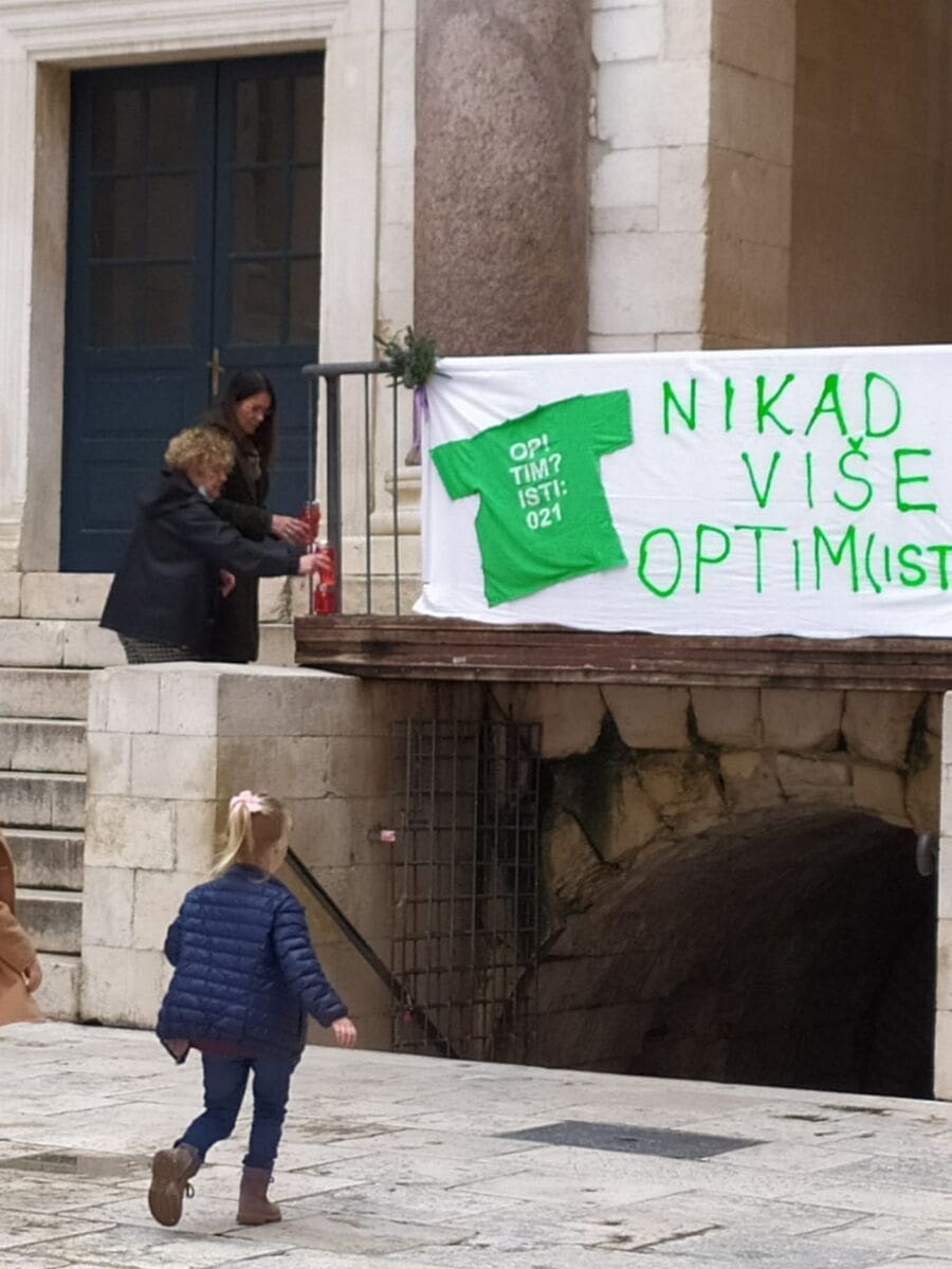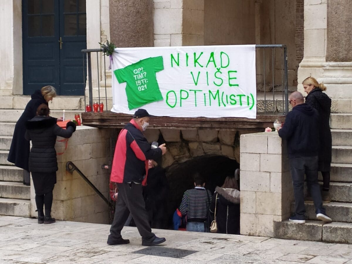 Doznajemo da su se već određeni građani Splita okupili na Peristilu. A njegovi dugogodišnji obožavatelji izvjesili su transparent u obliku majice na kojoj piše: "Nikad više optim(isti)".