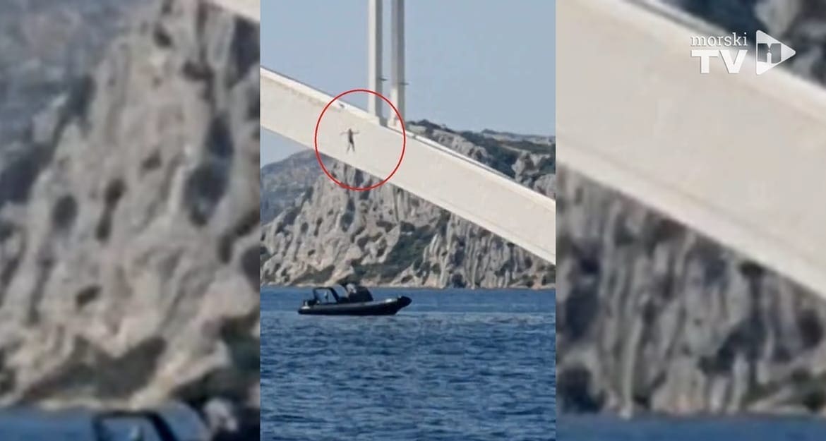 Osoba u kupaćim gaćama hoda po donjoj, lučnoj konstrukciji šibenskog mosta i u jednom trenutku se s njega baca.