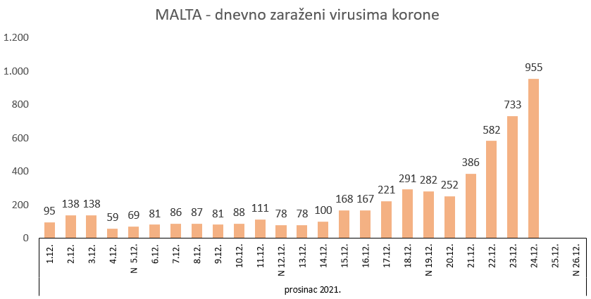 Malta, koja je isticana kao primjer dobre procijepljenosti, ukupno dobrog nadzora i smanjenja broja zaraženih i preminulih od korona virusa upravo sada kroz posljednja četiri dana proživljava eksploziju zaražavanja omikron sojem korone, kako izvještava Times Malta https://timesofmalta.com/articles/view/new-malta-covid-19-record-with-733-cases.923425.
