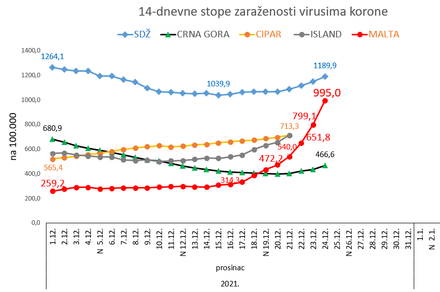 Kroz cijeli mjesec prosinac na Malti su do sada preminula dva bolesnika. U istom razdoblju u SDŽ preminulo je 83, u Crnoj Gori 79, na Cipru 28 te na Islandu 2 bolesnika. Ovo sve ukazuje da su umrli žrtve patogenijeg delta soja nego što je to omikron.