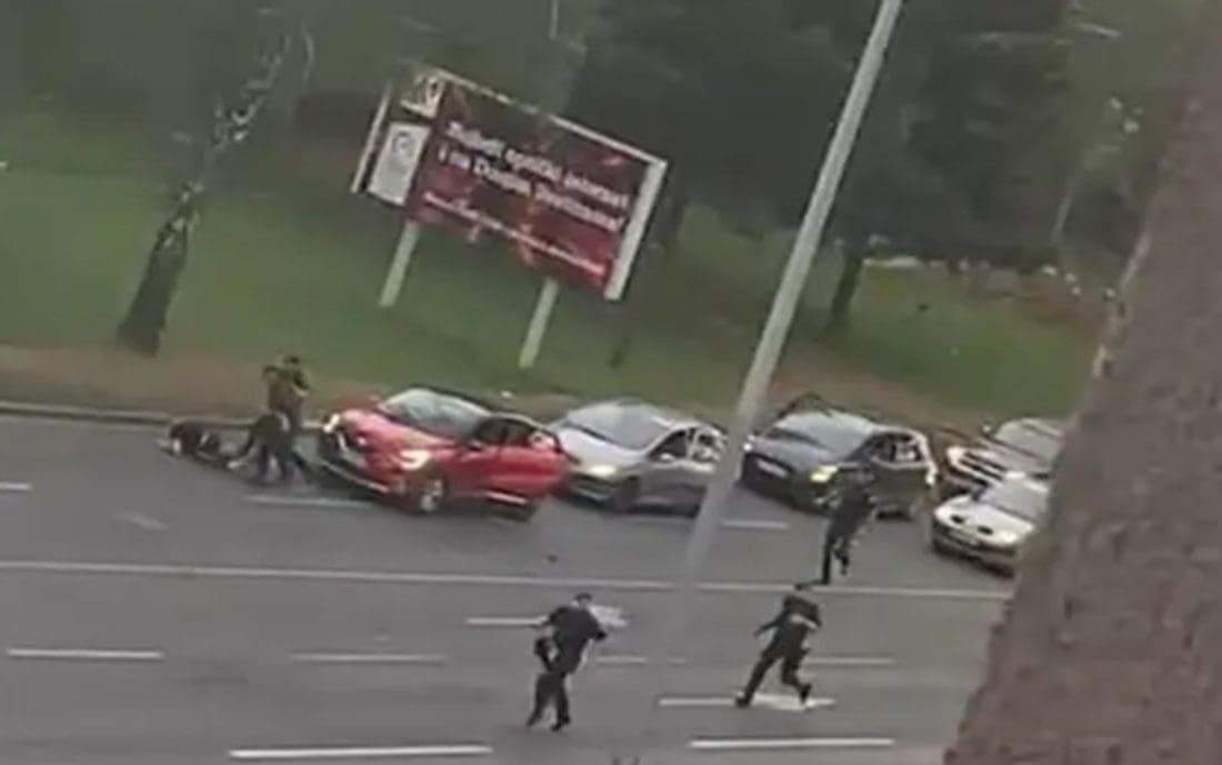 Auti stoje dok se muškarci tuku nasred ceste, a čuje se i zvuk razbijenog stakla. Nakon nekoliko sekundi trojica interventnih policajaca trči prema skupini izgrednika i pokušava ih uhvatiti.