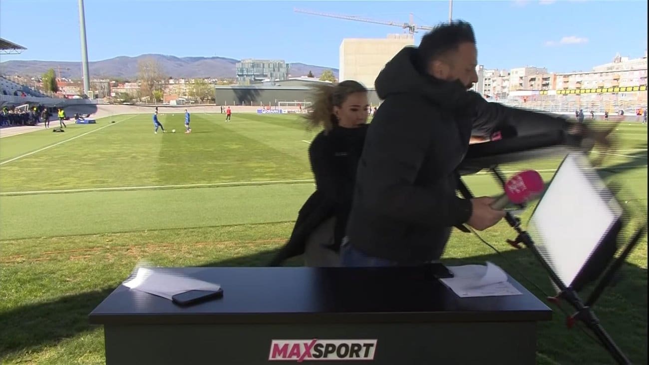 "Znamo kome se piše obrana sezone. Respect", našalila se uz snimku trenutka kad ju je bivši vratar Dinama Ivan Kelava spasio od reflektora koji je na nju skoro srušio vjetar dok su bili u prijenosu uživo.